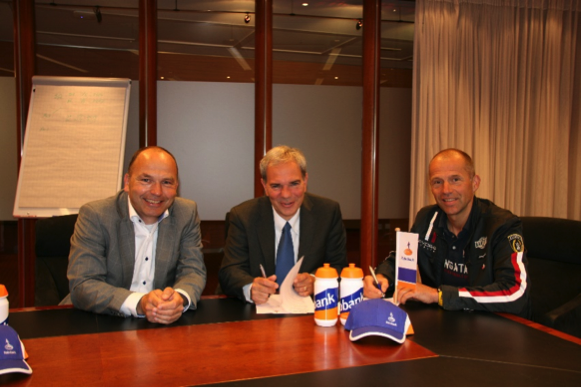 Ondertekening van de overeenkomst. V.l.n.r. André Bruins (Zeevang Sport), Henny Maes (Rabobank), Carl Hagenhoek (Zeevang Sport).