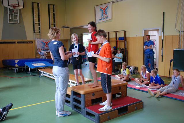 Op zaterdag 2 juli 2011 is weer de jaarlijkse gymwedstrijd voor de jeugd (8-12 jaar) gehouden. Onder toezien van een groot en enthousiast publiek gingen de kinderen de onderlinge strijd aan. Er waren allerlei oefeningen die zij moesten doen, o.a. balvaardigheid, klimmen, trampoline, paard, touwtje springen. Een vakkundige jury hield alles goed in de gaten en uiteraard gaf juf Astrid nog de laatse instructies en motivatie aan de kids. Uiteindelijk heeft iedereen heel veel plezier beleefd. De wedstrijd is uiteindelijk gewonnen door Anne Kooijenga.